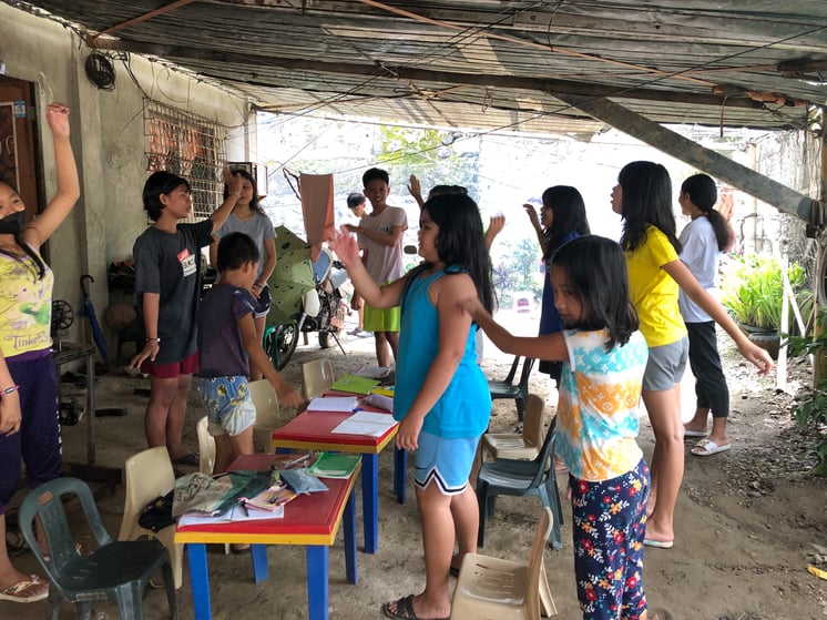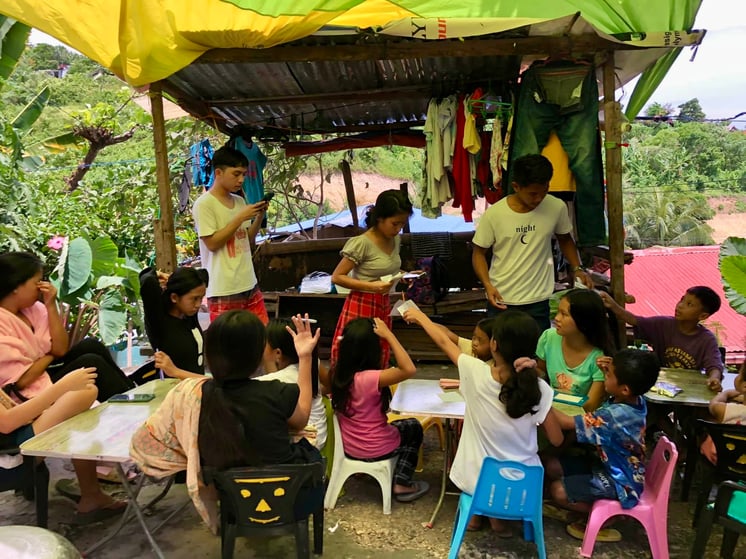 一方、セブ市の子どもたちの集落には共有スペースがあるため、広場に集まって学習をしています。
